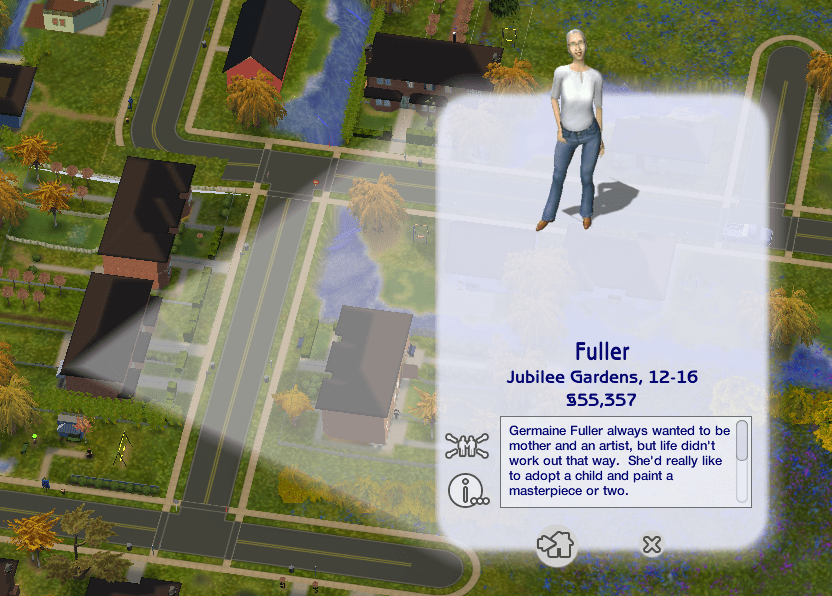 Personal Bio: Germaine Fuller wanted to be an artist and a mother, but life didn’t work out like that. Now she is retired, she doesn’t feel obliged to fit the skinny, dressed for success sterotype and is very happy in her oldest jeans painting whatever she feels like. She would still like to meet somebody special and wonders about fulfillng those maternal urges by adopting. She has toyed with the idea of writing a best seller about the female sims, love and diet called “noinstantlove” She is a fun-loving Sim and enjoys people around her. She’s going to miss the girl from the flat upstairs – Emily Cowper – who recently moved over the water to get married. She has no intention of doing anyone else’s gardening!
