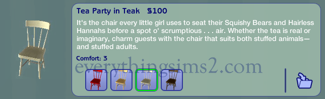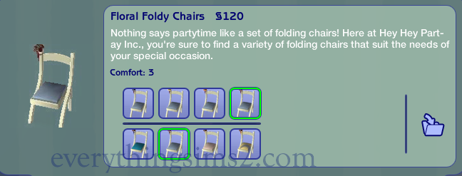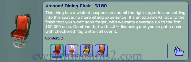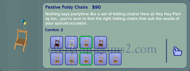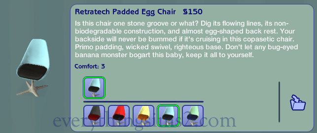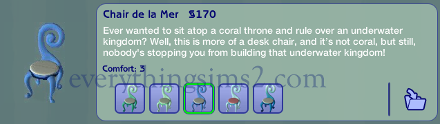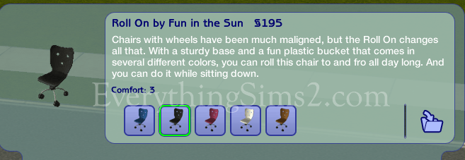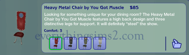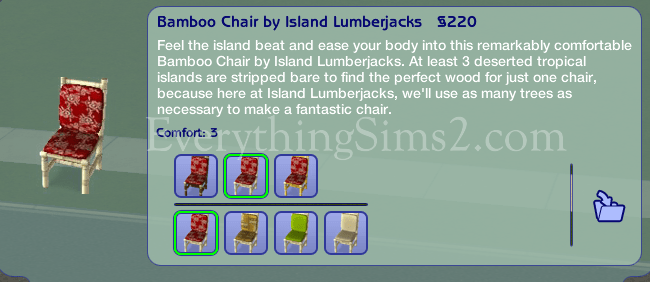 Everything on this page is listed by price – not alphabetically – and can be found in The Sims 2 Comfort Category.