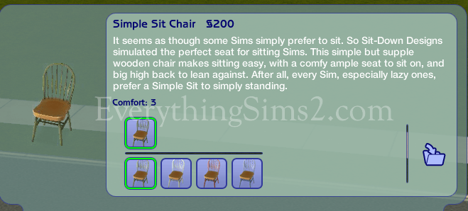 It seems as though some Sims simply prefer to sit. So Sit-Down Designs simulated the perfect seat for sitting Sims. This simple but supple wooden chair makes sitting easy, with a comfy ample seat to sit on, and big high back to lean against. After all, every Sim, especially lazy ones, prefer a Simple Sit to simply standing.
