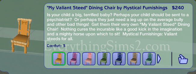 Is your child a big, terrified baby? Perhaps your child should be sent to a psychiatrist? Or perhaps they just need a leg up on the average bully and other bad things! Get them their very own “My Valiant Steed” Dining Chair! Nothing cures the incurable like a good kick in the imagination and mighty horse upon which to sit! Mystical Furnishings: Valiant steeds for all.